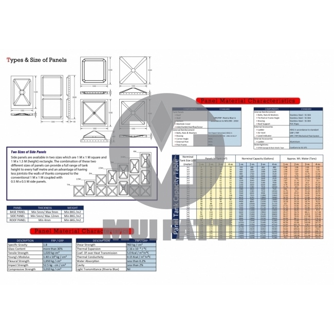 YT GRP/FRP panel manufactured from combination of (1) unsaturated polyester resin with reinforced with (2) E-Class Chopped Stranded Mat and (3) E-Glass Woven Roving. All material comply to BS 3532, BS 3496, BS3479. Under the scheme of supervision and quality control specified by SIRIM, YT GRP/FRP Sectional Panel comply to :- (i) Confirmed to be non-toxic, odourless and is save for portable water storage designated for human comsuption; (ii) Modular that you can create the required capacity freely depending on the volume of water required and space available; (iii) Assembled by connecting independent angular panel with bolts and reinforced by external & internal bracing; (iv) several times lighter than steel panel (v) Vigorously designed to withstand both hydrostatic and dynamic water pressure exceeds six times it rated capacity; (iv) rust free, a factor which greatly improves sanitation, composite plastics which non-corrodable properties greatly extend the life span of the tank and minimise maintenance.